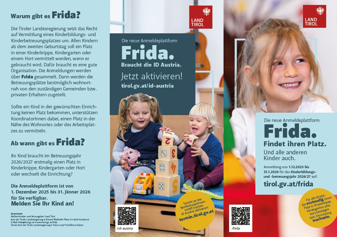 Ab 1. Dezember 2025 steht mit FRIDA eine zentrale digitale Plattform für Anmeldungen zu Kinderkrippen-, Kindergärten- und Hortplätzen in Tirol zur Verfügung. Die Anmeldung für das Betreuungsjahr 2026/2027 erfolgt damit erstmals digital. FRIDA ist für alle Kinder, die erstmalig einen Kinderbildungs- und Kinderbetreuungsplatz in Anspruch nehmen möchten bzw. in eine andere Einrichtung wechseln.