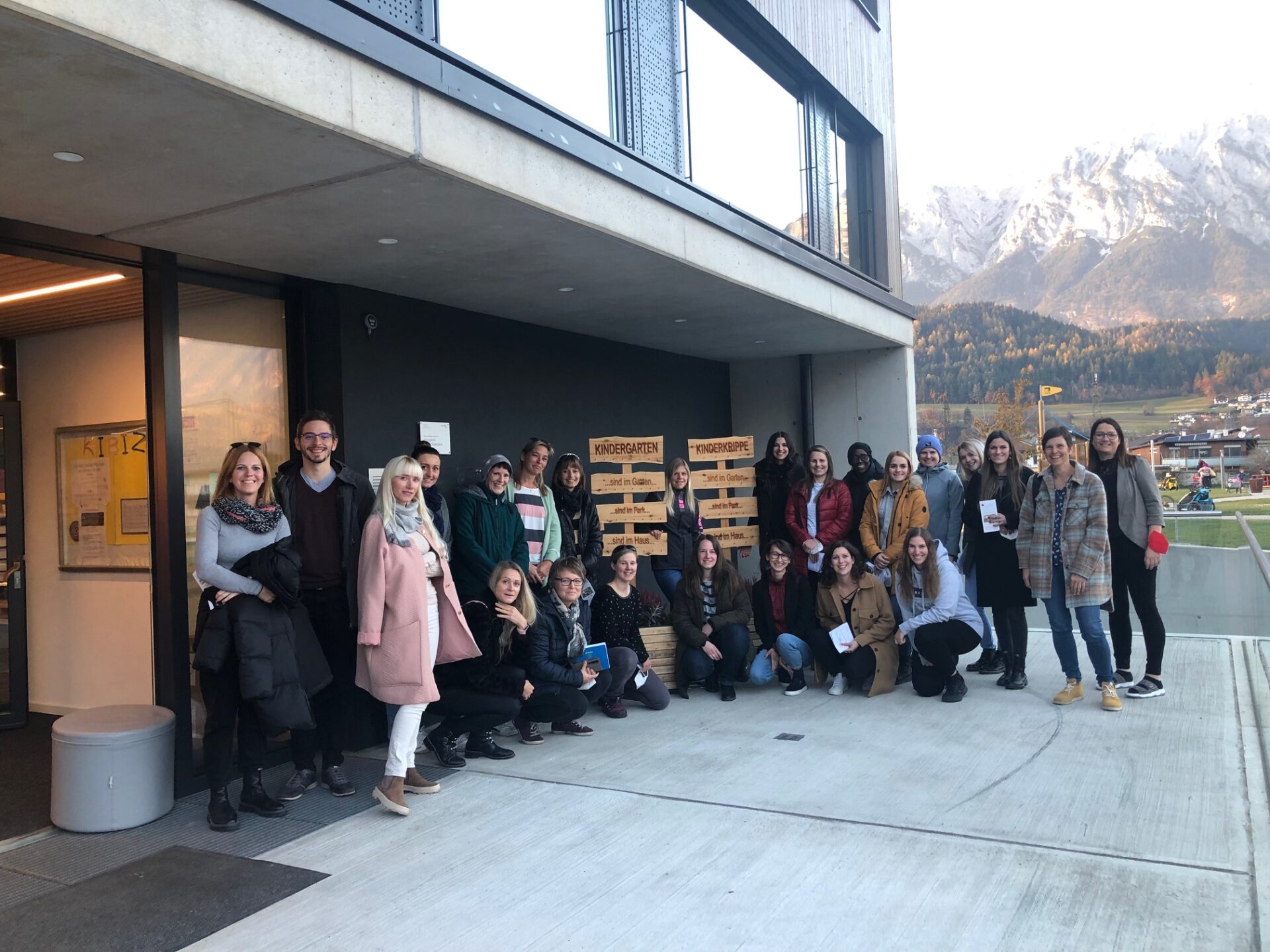 Kinderkrippenleiterin Cornelia Kreidl und Kindergartenleiterin Andrea Klingenschmid führten am 12. November die 23 Studierenden des Kolleg IV durch das neue Kinderbildungszentrum in Volders, auch KiBiZ genannt. Gezeigt wurden uns helle freundliche Räumlichkeiten, gut überlegte Ausstattung und vielfältiges Material. Als Herzstück in dem modernen Gebäude kann wohl die Großküche bezeichnet werden, in dem Küchenleiterin Rosa Prem mit ihrem Team für die Kinder täglich frisch kocht. Bei den Lebensmitteln wird auf saisonale, regionale und biologisch angebaute Produkte geachtet. Es hat uns beeindruckt, dass auf Esskultur und die Zubereitung der Gerichte viel Wert gelegt wird, immer wieder werden beim Kochen auch Kinder miteinbezogen. Als weitere Besonderheit handelt es sich beim KiBiZ um ein Haus der Generationen: Im obersten Stockwerk ist betreubares Wohnen möglich, in einigen leistbaren Wohnungen sind vor kurzem junge Familien eingezogen. Das Kolleg bedankt sich für die vielen Einblicke und wünscht dem pädagogischen Team im KiBiZ schönes erfolgreiches Arbeiten!