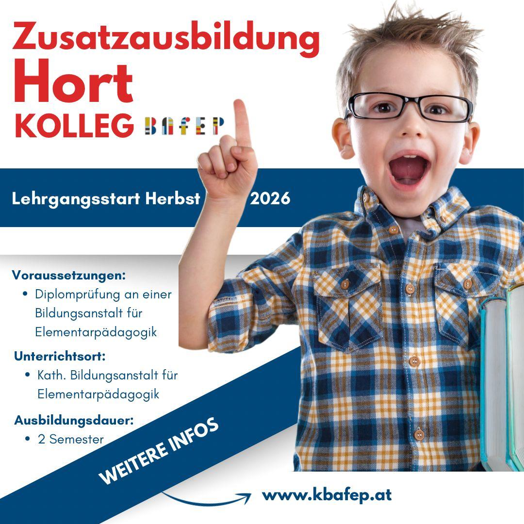 Ab Herbst 2026 gibt es wieder die Möglichkeit die Zusatzausbildung HORTERZIEHUNG zu belegen. Das Angebot richtet sich einerseits an Kolleg-Studierende, welche diesen Lehrgang parallel zur ihrer Ausbildung besuchen können, aber auch an BAfEP-Absolvent:innen.